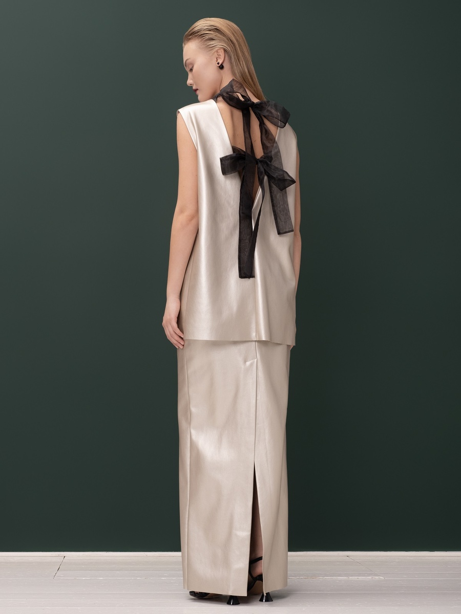 Продолжаем вас знакомить с нашей новогодней коллекцией. Роскошная двойка из экокожи для вашего вечера. В этом образе вы точно не останетесь незамеченной ✨ • Золотой топ с вырезом. Манящий вырез на спине, украшен двумя бантами из органзы. С помощью лент можно регулировать ширину изделия под себя. • Золотая юбка из экокожи. Юбка длины макси. Разрез сзади обеспечит комфорт при носке изделия. Ждём вас на примерку в VIRELE 🤍