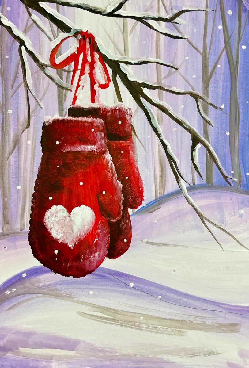 Пошаговое рисование гуашью сюжета "Варежки". Уровень подготовки - средний. Самостоятельное воспроизведение урока по видео от 10 лет. Ссылка на видеоролик: https://dzen.ru/video/watch/6745b386c00ada7a5186c933 Для создания картины нам потребуются следующие инструменты и материалы: · плотный лист для гуаши или акварельный лист (на видео-примере формат А3); · гуашевые краски 12 или более цветов; · простой карандаш; · ластик; · салфетки; · палитра; · баночка с водой; · кисти синтетические и натуральные: плоская квадратная номер 10, круглая синтетическая номер 5 и круглая натуральная номер 3. Центром данной композиции будут забытые рукавички на ветке, которую мы наметим простым карандашом слева на листе. Набросок в этот раз простым карандашом будет небольшим так, как все основные детали мы сможем сделать сразу красками кисточкой. Сначала наметим две рукавички, которые будут висеть друг за дружкой. Они будут крепиться, веревочками к ветке и изогнутую линию горизонта в виде сугробов снега. Мы