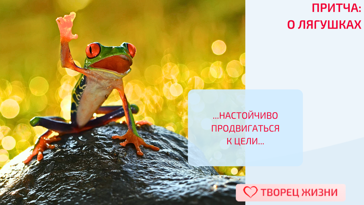 Все больше лягушек теряли последние силы и покидали соревнование, но одна лягушка продолжала настойчиво продвигаться к цели. Она никак не хотела сдаваться. В конце концов не осталось никого, кроме этой лягушки, которая с невероятными усилиями единственная достигла вершины башни. После соревнования другие участники захотели узнать, как же ей это удалось. Одна из лягушек-участниц подошла к победительнице, чтобы спросить, как ей удалось достичь таких невероятных результатов и прийти к цели. И оказалось, что победившая лягушка была глухой!