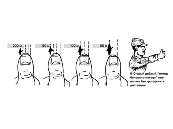 Как определить расстояние до человека, если под рукой нет дальномера? Дальномера-то нет, но есть спичечные коробки, зажигалки да большой палец руки, наконец. Зажигалку можно потерять, а палец на такой случай специально продублирован матушкой-природой!