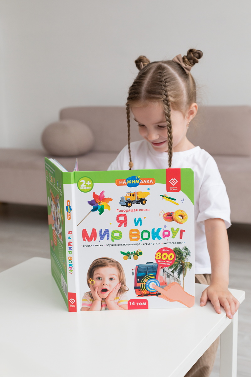 Не обязательно покупать специальные наборы карточек с эмоциями. Обычно в книгах по развитию для самых маленьких имеется раздел, посвященный эмоциям. Есть такие разделы и в книгах компании BertToys. Например, в Нажималке «Я и мир вокруг» есть целый разворот, посвященный эмоциям. На двух страницах книги помещены изображения детей, которые играют, балуются, плачут, веселятся. С помощью этих иллюстраций взрослые могут учить ребенка распознавать эмоции других детей по мимике, движениям и позам. В отличие от стандартных карточек или развивающих книг, иллюстрации говорящей книги от BertToys сопровождаются интересным звуковым наполнением. Можно выбрать один из трех режимов. В одном режиме ребенок послушает, что нарисовано на картинке, в другом узнает интересные факты на соответствующую тему, а в третьем — сможет поиграть в режиме «вопрос–ответ». Нажималка незаменима в том случае, если маме срочно нужно сделать важные дела, а ребенка хочется занять чем-то интересным и полезным для его развития.
