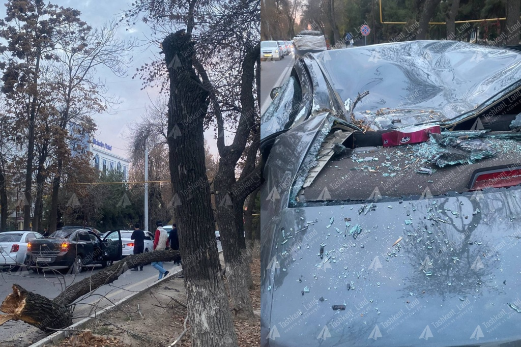 В Ташкенте большая ветка дерева упала на проезжающую машину. Есть пострадавшая