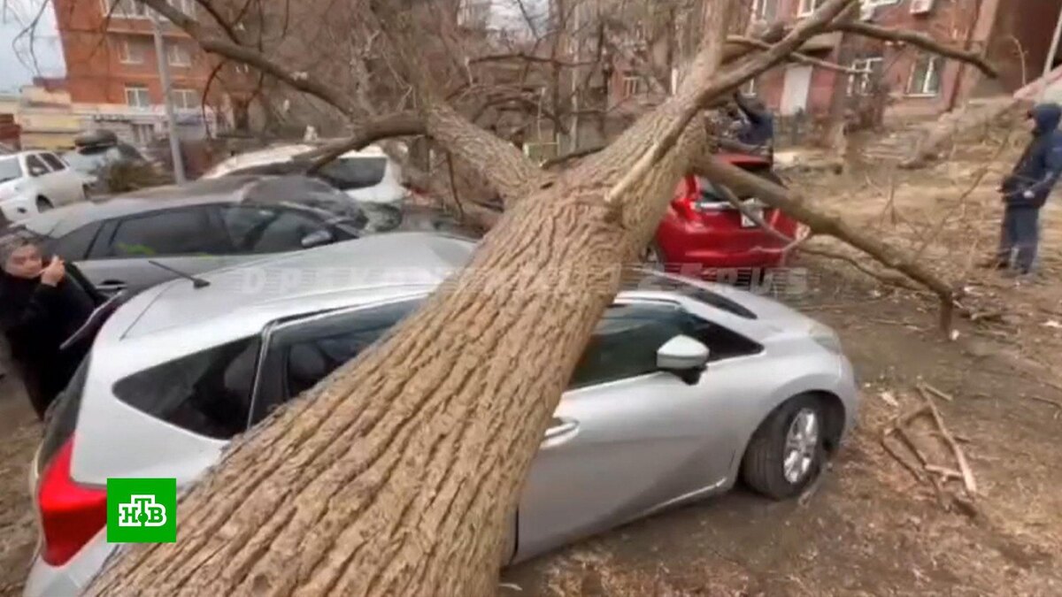 Штормовой ветер во Владивостоке валит деревья и сбивает людей с ног