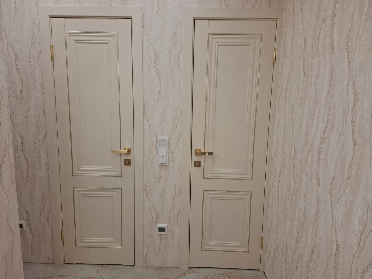 Обзор установки дверей Прадо с эмалевым покрытием цвета слоновая кость и золотым молдингом в квартире клиента