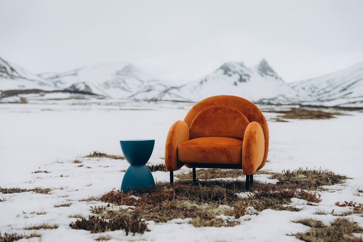 - Терракотовое кресло округлой формы добавляет теплоты и уюта. Бархатная текстура усиливает ощущение комфорта, перекликаясь с жаром вулканической лавы.