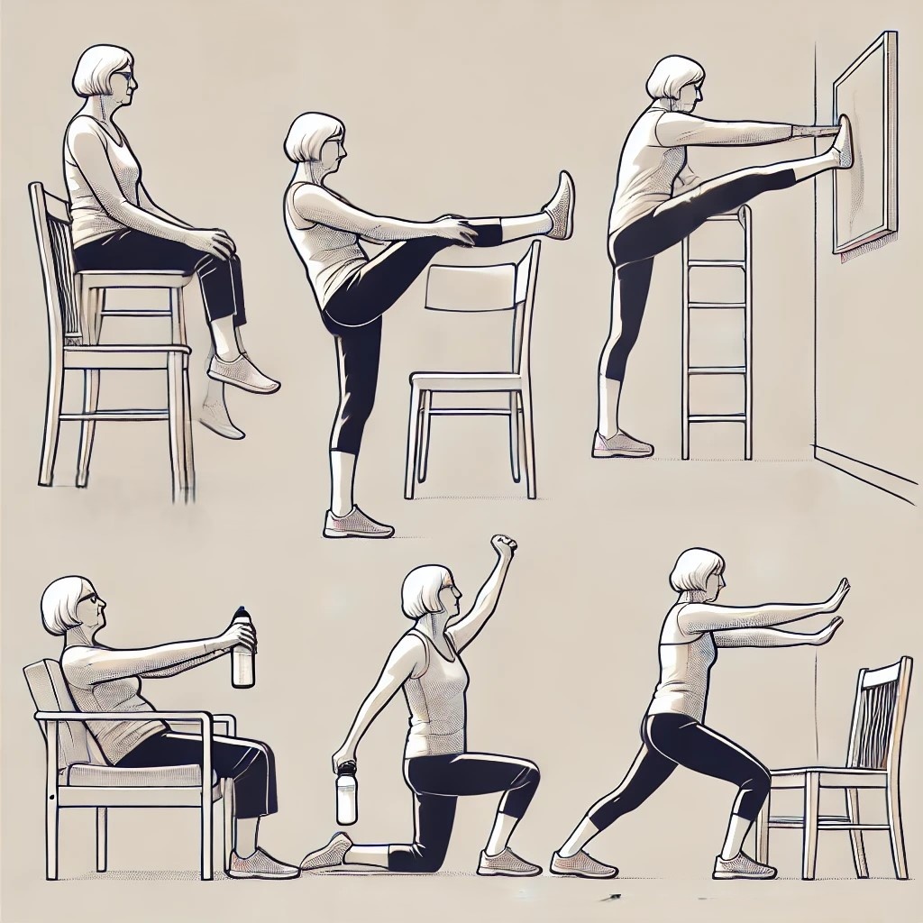 - Как выполнять: Встаньте ровно, ноги на ширине плеч, рядом с опорой (спинка стула или стенка).
