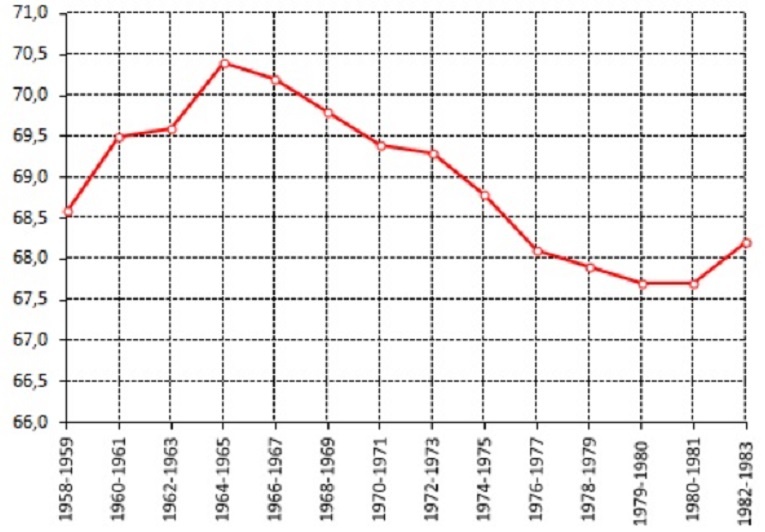 Время активности Хрущева 1953-1964. И хотя внешне Хрущев выглядит дурачком за пределами подковерной борьбы за власть, цифры свидетельствуют в его пользу.