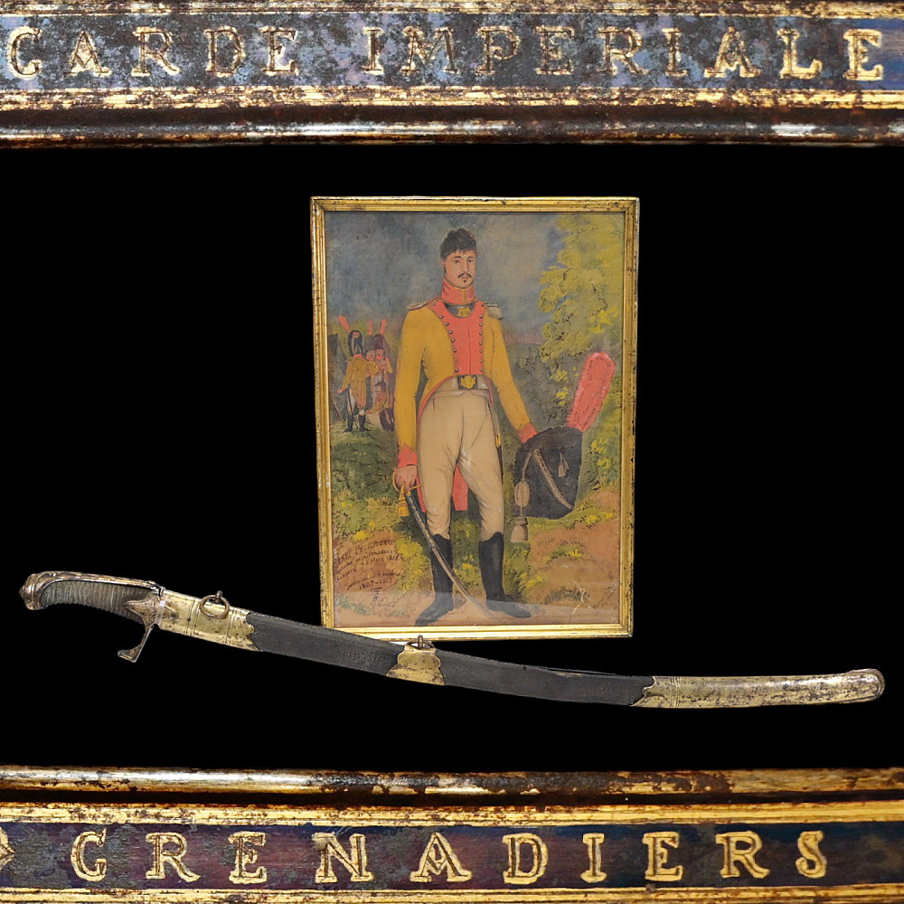 На испанском аукционе Costa Blanca Auctions выставлена на продажу сабля периода Первой империи во Франции и в комплекте с ней портрет офицера той же эпохи. Подписан лот следующим образом: «Офицерская сабля гренадеров Императорской гвардии и портрет владельца». На приведенной фотографии выше и ниже общего изображения лота даны фото надписей на обеих сторонах лезвия сабли, которые действительно гласят «Императорская гвардия» и «Гренадеры», соответственно. Не будучи глубоко погруженным в тему оружия, совершенно дистанцируюсь от каких-либо комментариев по поводу самой сабли. Если кому-то из читателей станет интересно, на Дзене есть знатоки оружейной темы, у которых можно уточнить, относится ли сабля к какому-то специфическом типу, характерному именно для Гвардии Наполеона или нет (скорее всего, нет) и пр. Обратимся к прилагающемуся к сабле портрету. Аукционное описание утверждает, что лот включает в себя «живописное изображение владельца сабли с памятной надписью о нем «Капитан Анри Пети П