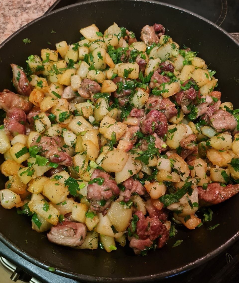 Снимаем с утиных окорочков филе, режем средними кусочками, солим, перчим, добавляем любые приправы по вкусу (у меня паприка и хмели-сунели), немного растительного масла. Все тщательно перемешиваем и оставляем на пару часов промариноваться. Картофель чистим и нарезаем кубиками. Обжариваем на растительном масле (я добавляю еще топленое масло) на сковороде. Не забываем солить по вкусу. Утиное филе обжариваем на сковороде (я масла не добавляла) и по готовности отправляем в сковороду с картофелем. Все перемешиваем, добавляем рубленную зелень, томим на малом огне еще минут 5-10. Вкуснейшее ароматное блюдо готово.