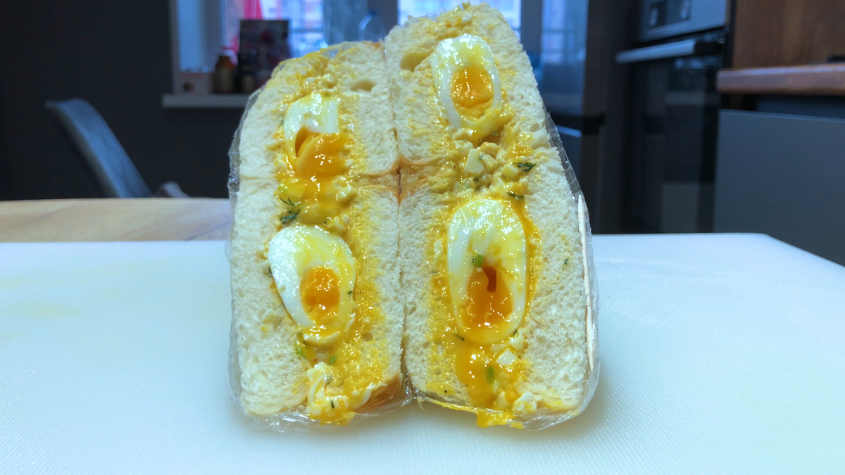 Японский яичный сэндвич. Сегодня я хочу его оценить. На вид здесь просто вареные яйца и хлеб. Но. НО. Но. ВЫ измените свое мнение если попробуйте такой яичный сэндвич. Очень мягкий и нежный сэндвич. Я только откусив его смог понять почему этот сэндвич такой популярный. Секрет этого яичного сэндвича в его простоте. Его стоит приготовить и попробовать. И вы сами поймете в чем его секрет. Еще один момент, сэндвич очень питательный. Я в этом вижу только плюс. Этот японский сэндвич также называют тамаго сандо. "Записка в магазин"... Яйцо - 2+3-4 штуки; Хлеб - пару кусочков. Хлеб рассматриваем только мягкий нежный, молочный. Вроде японского шукопан. Я покупал пампушку. Горчица - 1 чайная ложка; Майонез - 2 столовые ложки; Укроп - 1 столовая ложка(измельчённая) или небольшая горсть; Зеленый лук - 1 столовая ложка(измельченного); Соль, черный и красный перец по вкусу. Пошаговое описание рецепта: Шаг 1. Два яйца надо сварить всмятку и 3-4 вкрутую. Яйца лучше за один раз опустить в едв