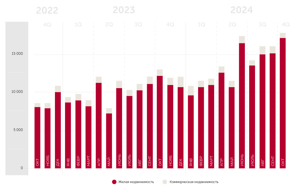 По информации из отчета на сайте propertymonitor.ae, в октябре 2024 года на рынке недвижимости Дубая был установлен новый рекорд: заключено более 20 тысяч сделок, что на 13% больше, чем в сентябре. Жилая недвижимость составила 95% от общего числа сделок. Большинство покупателей выбирают объекты на стадии строительства.