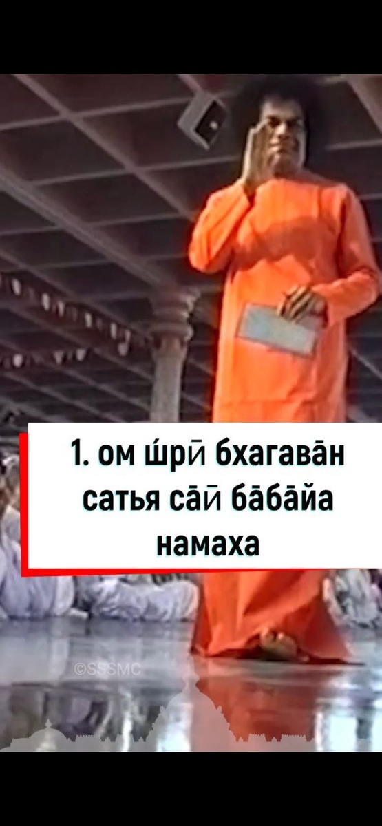 1. Ом Ш́рӣ Бхагавāн Сатья Сāӣ Бāбāйа Намаха108 имён Шри Сатья Саи Бабы К 100-летию Бхагавана мы начинаем воспевать 108 имён Шри Сатья Саи Бабы! 1. Ом Шрӣ Бхагавāн Сатья Сāӣ Бāбāйа Намаха Сатья “Матерь” Саи Бабы Ишварамба просила Его себе в сыновья посредством совершения целого ряда Врат (обетов), посвященных Сатьянараяне. Именно потому Его и назвали Сатьянараяна и звали Сатьей до четырнадцати лет - до тех пор когда Он решил, что настало время возвестить, о том что Он – никто иной, как Саи Баба, явившийся вновь. Сāӣ Бāбāйа Поэтому Его следует почитать как Саи Бабу. Миллионы знают Его как Саи Бабу или же “Сатья” Саи Бабу (“Истинного, подлинного” Саи Бабу). “Саи” значит Господь, Владыка (Шахи, Шах, Падишах, Сахи, Сайи, Саи). Оно значит также “Са” – Сарвешвара – Властелин; Айи – Мать; Баба – Отец. Таким образом, Саи Баба значит – “Владыка, Мать и Отец”. Намаха “Намаха” значит склоняться, кланяться со сложенными ладонями, посвящая Богу десятью сложенными вместе пальцами десять органов чувс