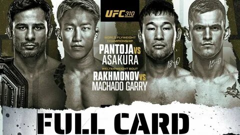 Дата: 7 декабря 2024 года Место проведения:T-Mobile Arena, Лас-Вегас, США Главный кард: - Александр Пантожа (чемпион) vs. Кай Асакура (поединок за титул чемпиона в наилегчайшем весе) - Шавкат Рахмонов vs. Иан Мачадо Гарри (полусредний вес) - Сирил Ган vs. Александр Волков (тяжелый вес) - Брайс Митчелл vs. Крон Грейси (полулегкий вес) - Нейт Ландвер vs. Ду Хо Чой (полулегкий вес) Предварительный кард: - Висенте Луке vs. Темба Горимбо (полусредний вес) - Мовсар Евлоев vs. Алджамейн Стерлинг (полулегкий вес) - Энтони Смит vs. Доминик Рейес (полутяжелый вес) - Рэнди Браунvs. Брайан Баттл (полусредний вес) Ранние прелимы: - Талиссон Тейшейра vs. Лукаш Бжеский (тяжелый вес) - Коди Дёрден vs. Джошуа Ван (наилегчайший вес) - Клэй Гуида vs. Чейз Хупер (легкий вес) - Майкл Кьеза vs. Макс Гриффин (полусредний вес) - Мартин Будай vs. Ризван Кунеев (тяжелый вес) Этот турнир обещает стать одним из самых зрелищных событий года благодаря насыщенному кард-расписанию и участию бойцов мирового уровня. Не