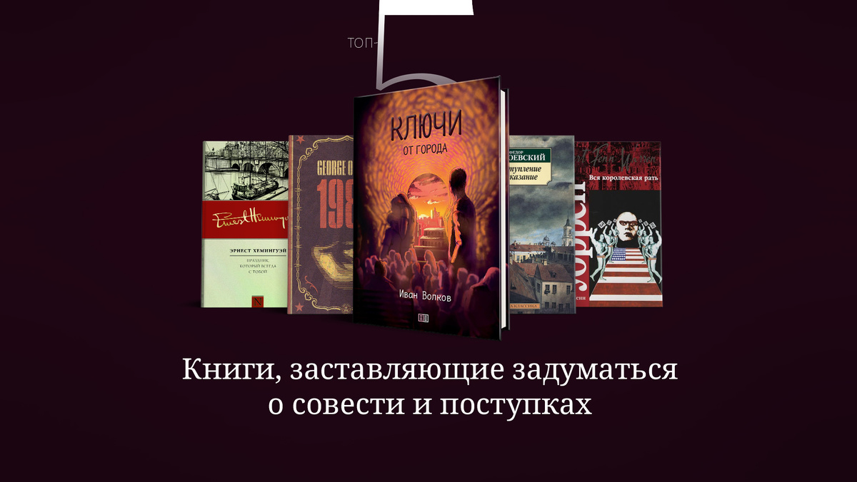 «Ключи от города» Иван Волков Это история молодого человека, чья жизнь кардинально меняется на фоне трагически утраченной любви. Главный герой погружается в мир афер и моральных компромиссов, проходя через внутреннюю борьбу и трудные выборы. Это роман о взрослении, падениях и поиске себя. «Преступление и наказание» Фёдор Достоевский Раскольников убивает старуху-процентщицу, уверенный в своей моральной правоте. Но вместо освобождения он погружается в мир вины и мучений. Роман о внутреннем суде и поиске искупления. «1984» Джордж Оруэлл В мире тоталитарного будущего, где мысли контролируются, Уинстон Смит решает бороться за свободу разума. Роман о подавлении личности, искушении властью и цене, которую приходится платить за истину. «Вся королевская рать» Роберт Пенн Уоррен Политическая драма о коррупции и власти. История падения политика Уилли Старка, раскрывшая темные стороны власти и влияния, меняющие жизни людей вокруг. «Праздник, который всегда с тобой» Эрнест Хемингуэй Мемуары Хемингу