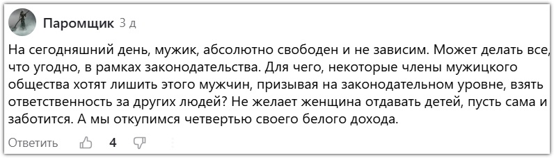 Мужчины, ваш выход. В комментариях к посту об отчуждении отцов один товарищ высказал такую мысль: Некоторый член мужицкого общества решил растолковать другому члену, что нормальные отцы не такие циничные, а автор предыдущего коммента, если придерживается своей позиции - Ал-ш и Му-нь: Вкратце, в посте речь шла о том, что в большинстве мужчины, вопящие об отчуждении, о настраивании детей матерями против отцов, о необходимости всех детей (ну или хотя бы мальчиков) оставлять с отцами и вообще ввести равную опеку без алиментов, на деле не особо предпринимают попытки как-то "отсудить" себе детей и отстоять права в правовом поле. Есть единицы, которые не отступают, настаивают, и любыми законными способами добиваются своего. Даже дожидаются момента, когда ребёнок подрастает, и мамка ему не указ, если он хочет видеться или жить с отцом. Но основная масса отцов всё-таки довольно аморфны: ожидая сопротивления бывших жён, не предпринимают ничего, кроме гневных комментариев в интернете. Вот и з