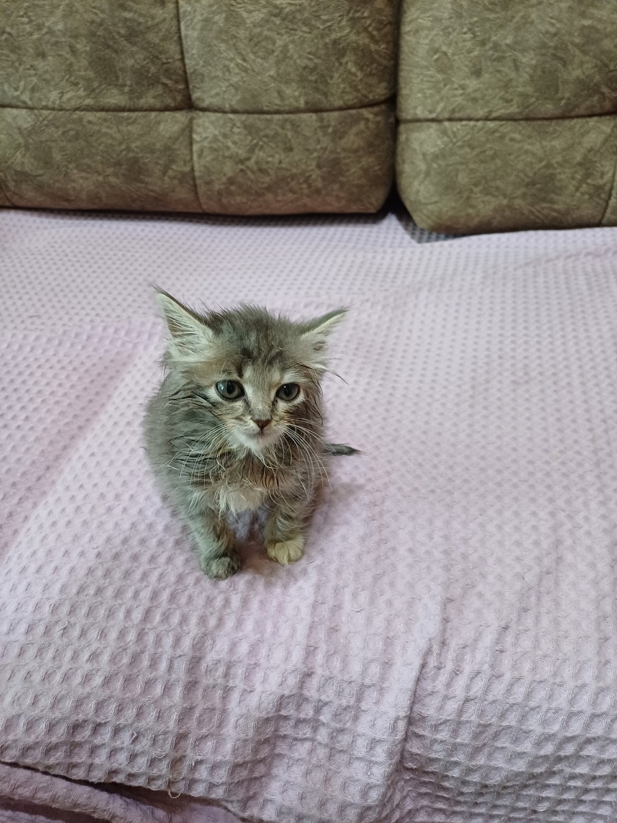 Ее забрали из условий, где животные долго не живут, и за всю свою жизнь ни разу не едят вдоволь. Она и так уже успала наголодаться так, что была готова есть все, что угодно (даже то, что не едят). Кроме того, котенок хромал на одну лапку. В первую очередь ее отвезли в клинику, где взяли анализы на инфекции и осмотрели. По результатам обследования, ветеринар сказал, что травма лапки была вызвана тем, что кто-то ее за эту лапку дернул.