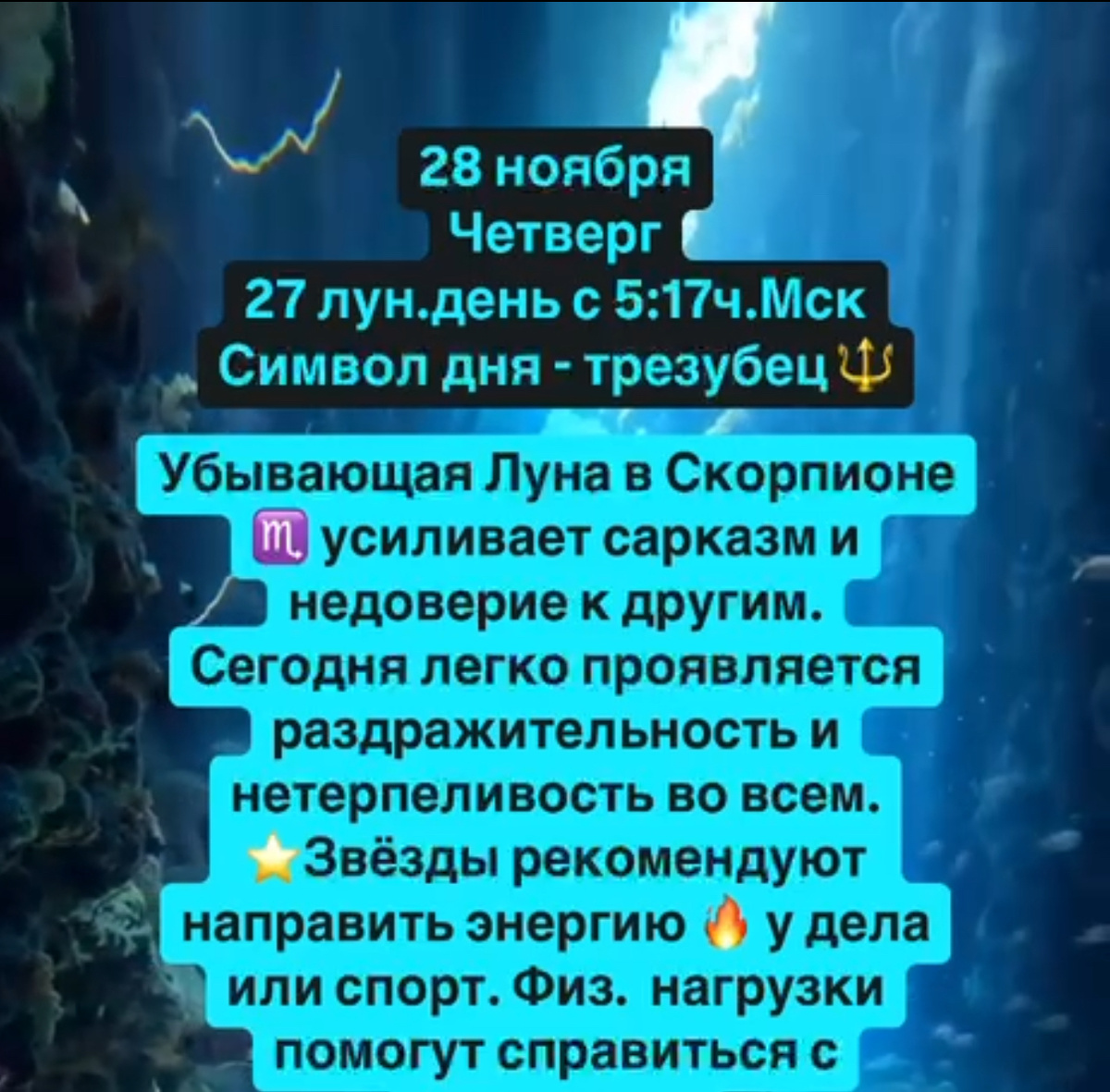 Убывающая Луна в Скорпионе ♏️ усиливает сарказм и недоверие к другим. Сегодня легко проявляется раздражительность и нетерпеливость во всем. ⭐️Звёзды рекомендуют направить энергию 🔥 у дела или спорт. Физ. нагрузки помогут справиться с эмоциями. 27 лун.день способствует получению сокровенных знаний. ⛔️алкоголь запрещен Сны и приметы вещие ✅стрижка ✅покупки не крупные #гороскоп #астрология #луна #астрологияонлайн #астропрогноз #овен #телец #близнецы #рак #лев #дева #весы #скорпион #стрелец #козерог #водолей #рыбы #затмениесолнца #солнечноезатмение #затмение #новолуниевблизнецах #загадываемжелания #загадайжелание #желание #Венера #мечтысбываются #полнолуние