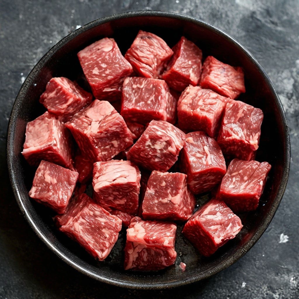 - Подготовьте мясо. Нарежьте говядину на крупные кубики (примерно 4-5 см). Это позволит мясу равномерно пропитаться вином и специями.