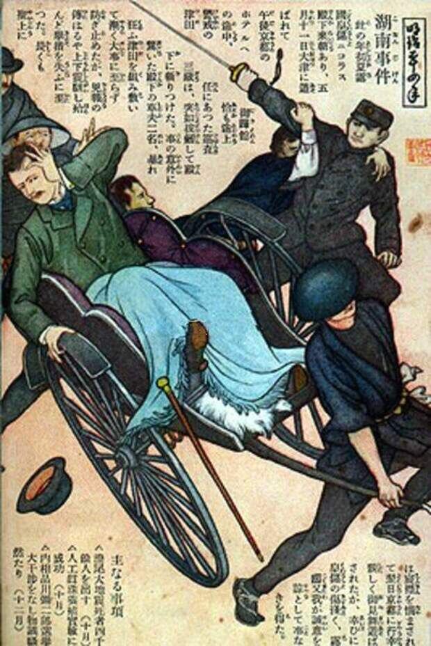 Это был первый визит иностранного принца в Японию. Его встретил тоже принц, но не наследный. Такэхито был членом дома Арисугава-но-мия, который являлся одной из ветвей Императорской семьи Японии. 15 апреля крейсер «Память Азова» вошел в порт Нагасаки. Посещение этого города не считалось официальной частью поездки цесаревича, поэтому много времени было уделено отдыху. Николай посетил русское кладбище в пригороде Нагасаки – Инаса. Он с удовольствием проводил время в обществе знаменитых гейш и даже сделал себе японскую татуировку в виде сказочного дракона. Потом последовали Кагосима, Кобе и далее Киото, где началась официальная часть поездки. 29 апреля намечалось посещение озера Бива, расположенное недалеко от Киото. Николая и его свиту к озеру везли на рикшах. После прогулки на катерах по озеру все отправились в город Оцу, где был устроен прием в резиденции губернатора. На обратном пути в Киото на одной из узких улочек Оцу произошел неприятный инцидент.