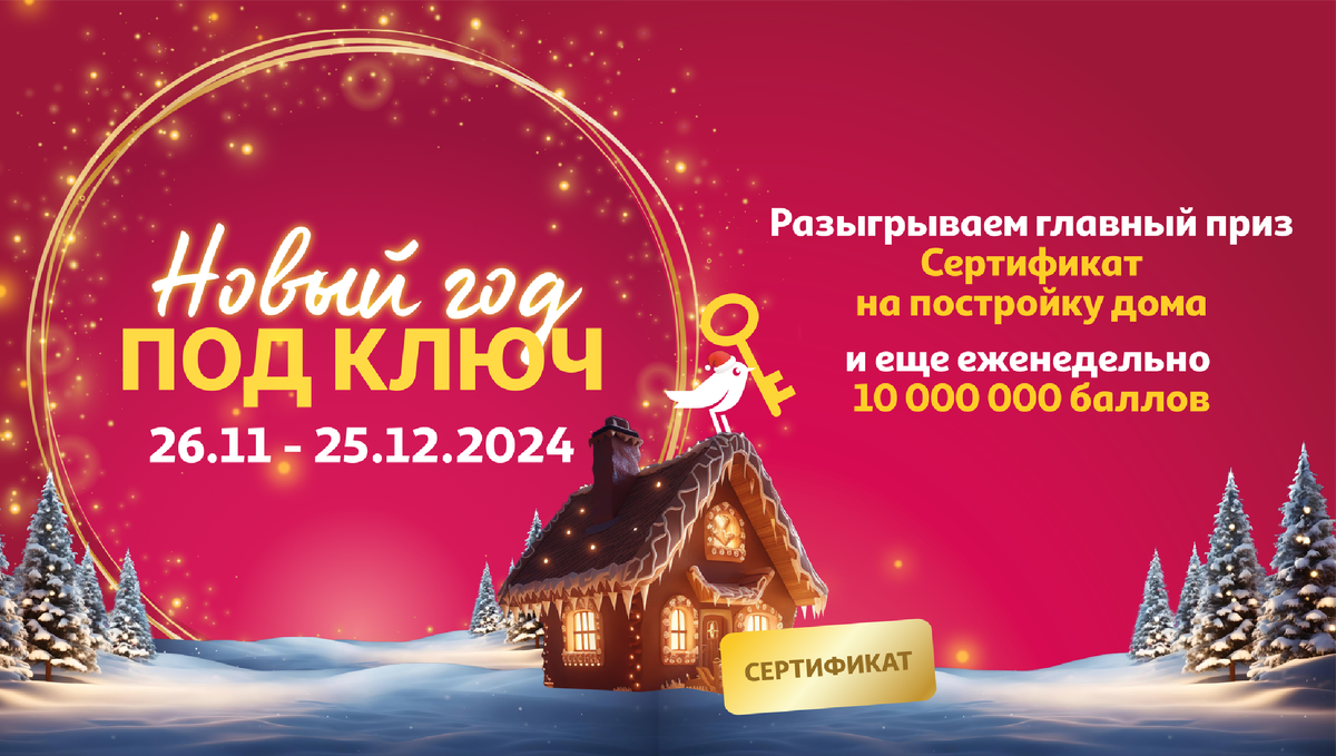 Помогаем Деду Морозу воплощать ваши желания! С 26 ноября по 25 декабря 2024 года мы разыгрываем 10 000 000 баллов и сертификат на постройку дома мечты. Как принять участие в розыгрыше? 1. Совершайте покупки с картой Ашан на сумму: – от 1 000 рублей в супермаркетах; – от 2 000 в гипермаркетах, на сайте auchan.ru или в приложении «Мой Ашан». Чем больше покупок, тем больше шансов выиграть! 2. Подпишитесь на рассылки по e-mail, СМС и пуш-уведомления. Для этого перейдите в приложении «Мой Ашан»: раздел «Мои данные» — «Настройка уведомлений». Хотите увеличить свои шансы на призы? С 5 декабря в мобильном приложении «Мой Ашан» будет доступна игра «Волшебное приКЛЮЧение». Зарабатывайте очки и повышайте рейтинг — топ-1000 участников получат дополнительный шанс выиграть дом своей мечты! В новой игре вам предстоит пройти по волшебному маршруту и выполнить 5 новогодних заданий: нарядить ёлку, выбрать подарки, украсить дом, создать свой новогодний образ и накрыть праздничный стол. Вжух — и новогодне