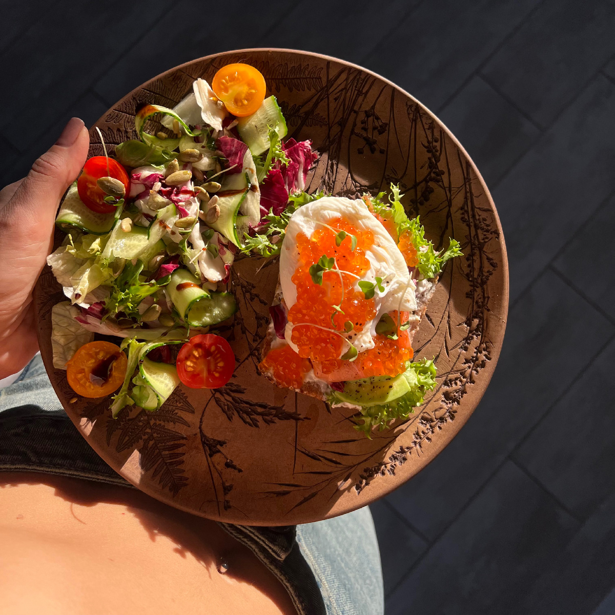 Я придерживаюсь принципов Гарвардской тарелки в каждом приёме пищи. Эта привычка была выработана годами и позволяет мне быстро и легко организовать свой рацион. - Белки, которые обеспечивают необходимую энергию и поддержку для организма. - Клетчатку, способствующую пищеварению и придающую чувство сытости. - Сложные углеводы, которые дают длительное насыщение и энергию. - Жиры, важные для здоровья клеток и гормонального баланса. - Белки, помогающие восстановлению и поддержанию мышц. - Клетчатку, обеспечивающую комфортное пищеварение. - Жиры, вносящие вклад в полноценность и питательность трапезы. Этот подход помогает мне создавать сбалансированные и питательные блюда каждый день. Брускетта: Зелёный салат: Здоровые отношения с едой - это баланс и уважение к своему телу Питание должно приносить радость и поддерживать здоровье, а не быть источником тревоги! Слушайте свои потребности и наслаждайтесь каждым приёмом пищи, находя гармонию и удовлетворение. Здесь вы можете найти все