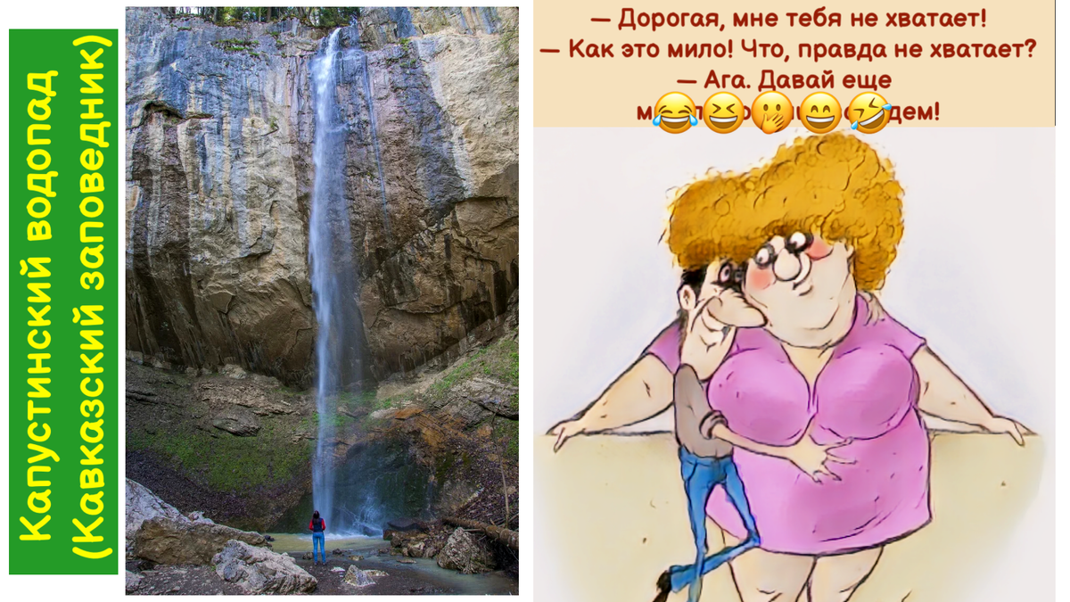 Поспорили русский, американец и немец, чьё эхо дольше продержится. Пришли в горы, немец крикнул – эхо 5 секунд продержалось, крикнул американец — 30 секунд гудело. Вышел русский собрался и крикнул: — Мужики водку на халяву дают!!! Эхо: — Где?!!!!!! — держалось несколько часов… /анекдот для хорошего настроения/ Мы живём в 30 км от Кавказского заповедника, и недавно снова выбирались в горы. Снова побывали на Капустинском водопаде. Правда мы были в сухое время года, и воды было совсем мало, но мощь каменной глыбы, с которой падаете вода, всё равно поражает. Лучше всего посещать Капустинский водопад весной, когда тают снега в горах, и в реках уровень воды поднимается. Также во всей красе увидеть водопад можно после затяжных проливных дождей. 🔥 А в качестве бонуса в конце публикации ⤵️⤵️⤵️ вас ждут весёлые, юмористические картинки (фотографии) с надписями, которые я сделала сама (используя нейросеть, редактор и другие инструменты), надеюсь, что они поднимут вам настроение Река Ка