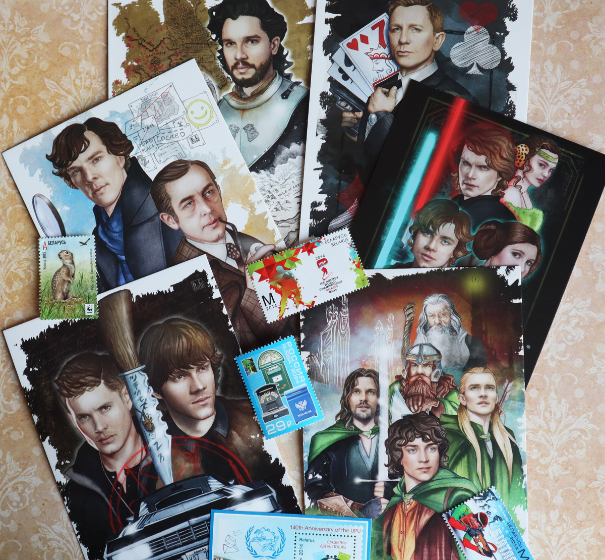 Дорогие друзья, сегодня покажу вам комплект моих авторских открыток, которые издает магазин Eden cards. Весь комплект из 12 штук ( 9 моих +3 другого автора ) можно купить на ягодном маркетплейсе. Конкретно в этой статье я покажу то, что рисовалось недавно для серии "Кино и сериалы". Начну с того, что открытки прекрасного качества : хорошая передача цвета и плотность, магазин упаковывает их в конверт и пленку. Мы сделали популярные фандомы и начали с Властелина колец. Я изобразила всех главных персонажей, которые смогли уместиться на открытку=) Покажу немного процесса создания иллюстрации : На радость девчатам, конечно, было принято решение нарисовать братьев Винчестеров из «Сверхъесте́ственное». 15 лет парни разбивали девичьи сердца, куда без них? Наши любимые Шерлоки =) Классический и самый полюбившийся всему миру - Василий Ливанов и не менее любимый всеми Бенедикт Камбербэтч - современная интерпретация Шерлока в 21 веке=) Герои популярного сериала "Игра престолов" тоже оказались