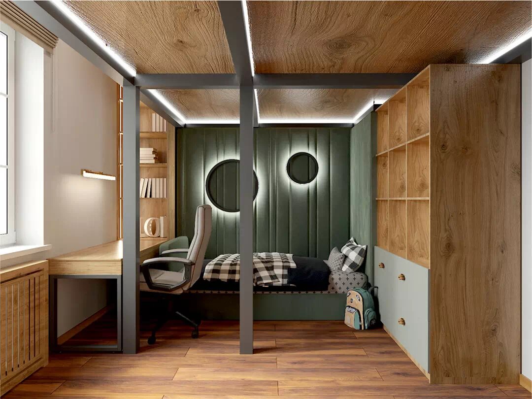 Мебель для мальчика в современном стиле, в сером, зеленом и бежевом тонах — проект 8591 Для создания комфортного функционального зонирования мебель в детскую комнату мальчика размещена в два яруса. Для этого построена металлическая конструкция в виде каркаса, обшитого натуральным деревом. Также из древесины выполнены мебельные каркасы и напольное покрытие. × Стол письменный 116 858 ₽ Подробнее × Стеллаж 115 678 ₽ Подробнее × Шкаф 235 898 ₽ Подробнее × Лесенка-стеллаж 285 162 ₽ Подробнее У входных дверей, слева, встроен шкаф для одежды. В его корпусе сделаны четыре распашных дверцы и два выдвижных ящика в нижней части. На всех фасадах — накладные круглые ручки. Частью системы хранения выступает комбинированный трехсекционный стеллаж с открытыми полками-нишами и парой ящичков. × Система хранения 283 080 ₽ Подробнее × Каркас игровой 830 341 ₽ Подробнее × Короб для радиатора 85 899 ₽ Подробнее Смежные стены в углу выделены изумрудно-зелеными стеновыми панелями с рельефной поверхностью. На