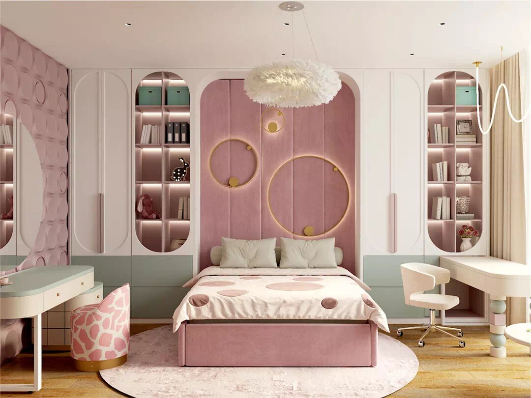 Дизайнерская мебель в комнату девочки с оригинальной яркой отделкой — проект 8245-2 Мебель в детскую девочки дошкольного возраста представлена с перспективой на вырост. Стильный интерьер легко, без радикальных изменений, адаптируется под потребности подростка. В цветовой палитре оформления предусмотрено использование белого, бежевого, розового, светло-зеленого тонов. Роскошно выглядит подвесной светильник с белоснежным плафоном в виде пушистого круглого облака с рельефной поверхностью. Область входной двери выполнена в пепельно-розовом оттенке. Слева от нее располагается мейкап-зона с большим круглым зеркалом на стене, отделанной панелями с 3D-эффектом. × Система хранения 519 865 ₽ Подробнее × Ниша 210 754 ₽ Подробнее Под ним установлен бело-зеленый туалетный столик с овальной столешницей. Один ее конец опирается на тумбу с тремя ящичками, второй — на рамную опору. Округлый пуф имеет дисковидную золотую опору, высокое цилиндрическое сиденье и низкую спинку. Его обивка — белая, с розовы