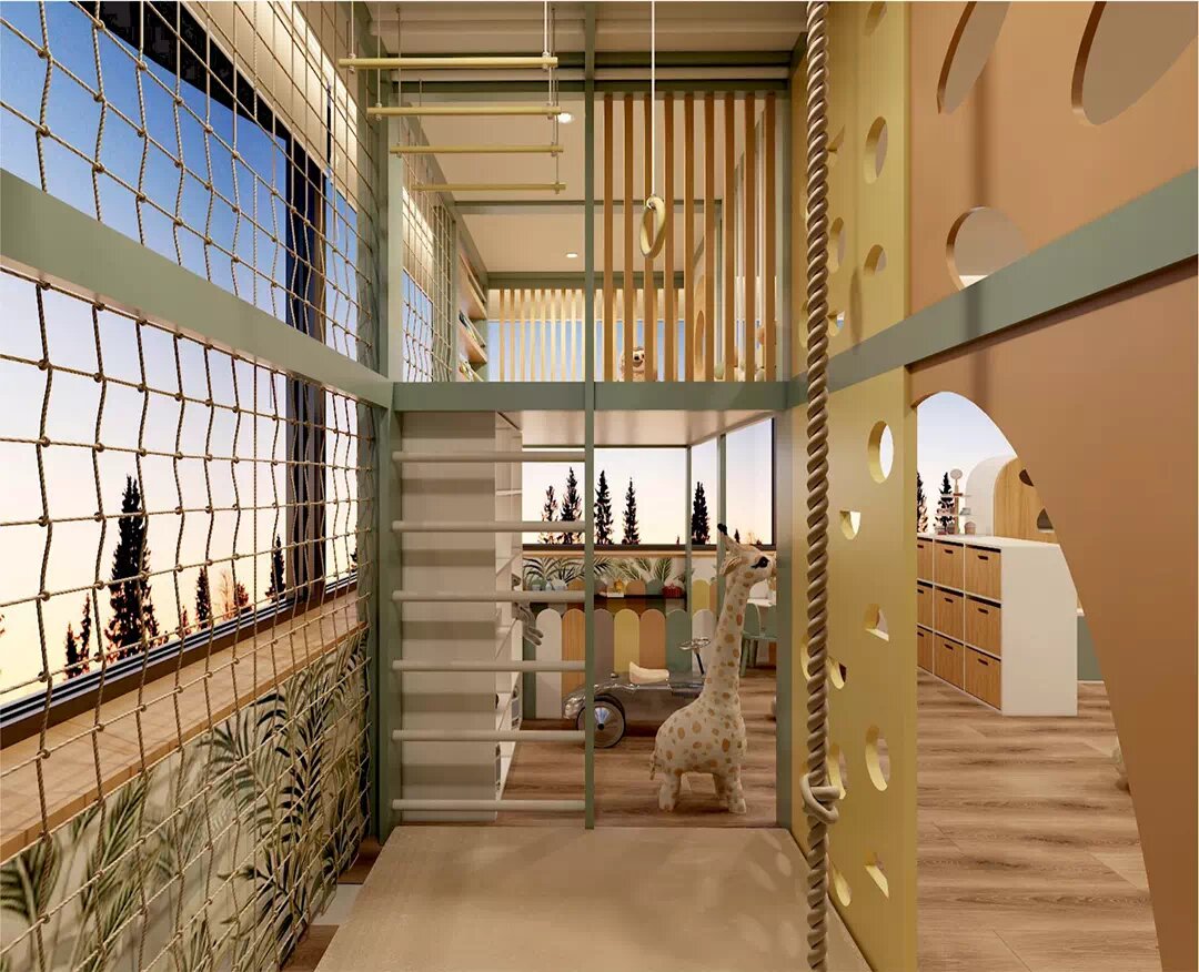 Мебель для детской игровой комнаты девочек с индивидуальным дизайном — проект 8245-1 Светлое, с большим количеством окон, помещение оформлено в африканском стиле, поэтому мебель в игровую детскую девочек создана в ярких цветах: оранжевом и зеленом. Широко применяется натуральная фактура дерева. Остекление большой площади обеспечивает достаточное количество естественного света в дневное время. Искусственное освещение издают подвесные светильники с плафонами, похожими на золотые сияющие облака. В торце комнаты располагается спортивно-игровой двухъярусный комплекс. Его передняя часть представляет собой перегородки с отверстиями — подобие скалодрома. Пол в спортивном уголке застилает мягкий мат. Здесь имеются веревочная сетка для лазания, канат, рукоход, гимнастические кольца, лестница для подъема на верхний ярус. Вверху располагается удобное уютное пространство для спокойных игр. Здесь сделаны полочки для книг и игрушек. × Стеллаж 615 997 ₽ Подробнее Внизу находятся открытый стеллаж и игр