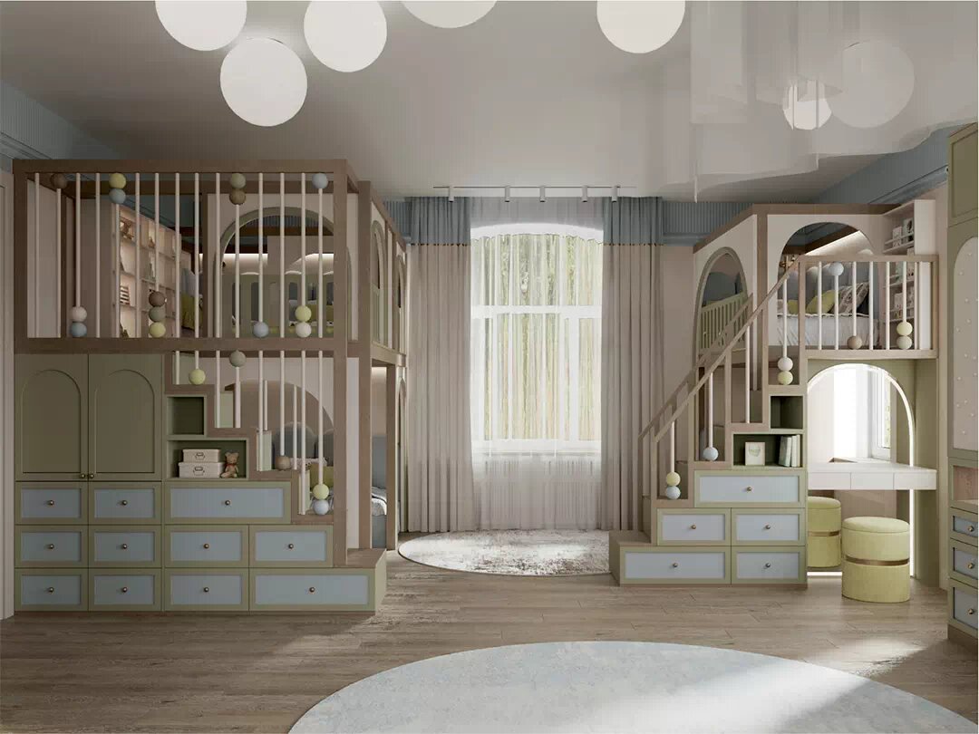 Современная мебель в игровую для двух детей выполнена с антресольными отсеками, распашными дверцами с фигурной вставкой на фасадах, полкой-нишей, шестью выдвижными ящиками. Окончанием мебельной композиции служит четырехдверный шкаф. Его боковая секция вмещает место для отдыха в округлой нише.