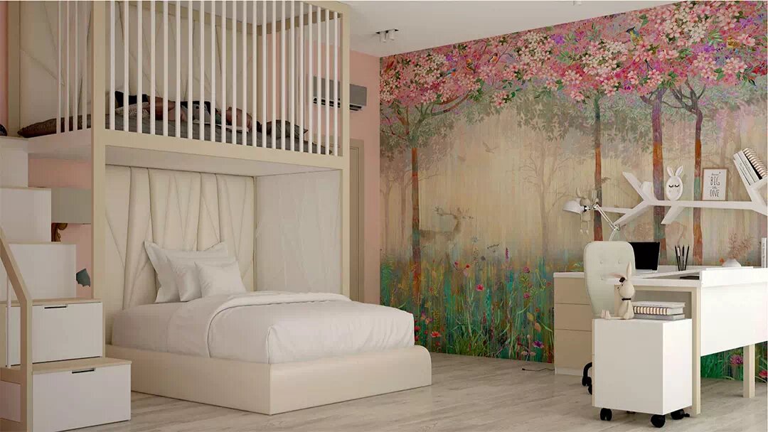 Светлая дизайнерская мебель для детской комнаты девочки с яркой акцентной стеной — проект 2793 Мебель в детскую девочки создана в теплых бежево-белых тонах. Они идеально гармонируют с общим спокойным оформлением помещения. Потолок – белый, со встроенными поворотными цилиндрическими светильниками. Напольное покрытие – в фактуре светлого дерева. Стена слева от входных дверей – акцентная. На ней изображены яркие цветущие деревья, лесная полянка, по которой ходят олени, а вдалеке кружат птицы. […] Статья Светлая дизайнерская мебель для детской комнаты девочки с яркой акцентной стеной — проект 2793 впервые появилась здесь ⋆ Фабрика мебели «Mamka™» ᐈ Эксперт детского пространства.