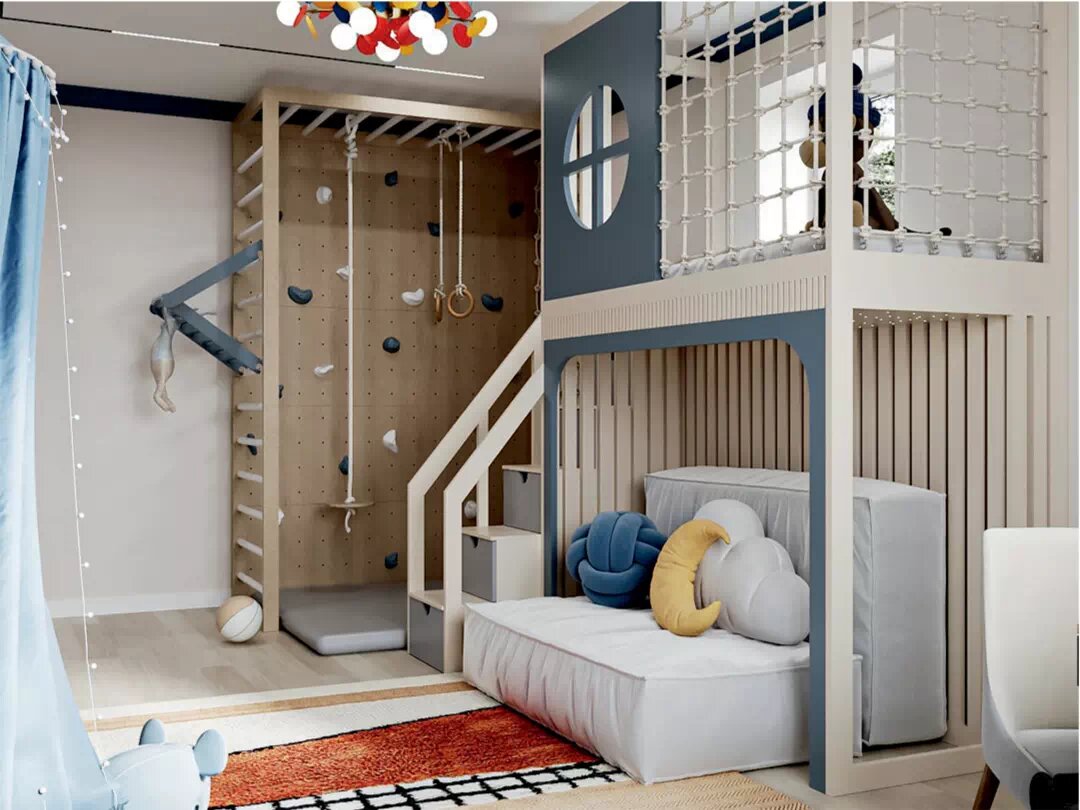 Мебель в детскую по индивидуальному проекту дополнена многофункциональным спортивным уголком. В качестве оборудования здесь используются П-образный рукоход, угловая перекладина, сетка из веревки, скалодром, гимнастические кольца и канат. Пол устлан толстым матом. Имеется симпатичный контейнер для хранения инвентаря и игрушек.
