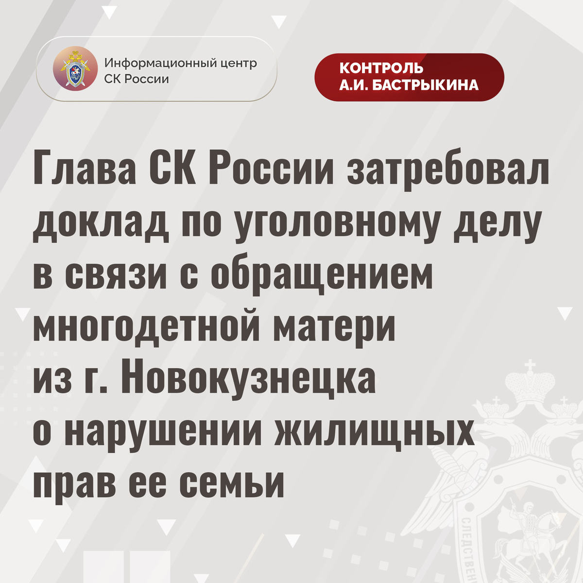 Глава СК России затребовал доклад по уголовному делу в связи с обращением многодетной матери из г. Новокузнецка о нарушении жилищных прав ее семьи