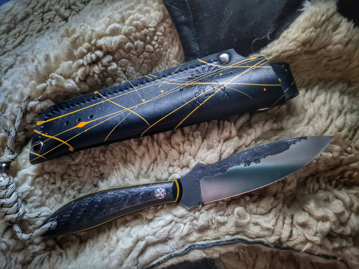 Сталь PGK, карбон на рукояти, спуски от обуха, но как бы и не от обуха, потому что голомень украсили дизайнерскими дырками от ковки. Возможно, не самое лучшее решение для PGK, которая именно в этих местах может ржаветь начать, но на дистанции посмотрим.