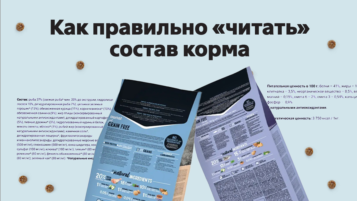 Готовый корм является оптимальным ежедневным питанием для кошек и собак, поскольку содержит все необходимые витамины, минералы, микро- и макроэлементы. Однако представьте себе ситуацию: вы приходите в зоомагазин в поисках корма, который подойдет вашему любимцу, но глаза разбегаются от обилия выбора. Мы расскажем, как правильно «читать» состав. Характеристики Напоминаем о том, что особое значение имеет то, подходит ли выбранный рацион по таким показателям, как возраст и вес. Например, корм, предназначенный для котенка, не подойдет котику старше 7 лет, и наоборот. Если же вы выбираете рацион для песика, обратите внимание на показатель размера любимца — Large, Medium или Small. Так как же «читать» состав? Согласно законодательству РФ, ингредиенты на упаковке корма должны быть указаны в следующем порядке: сначала тот, процент которого содержится в рационе больше, а дальше - по уменьшению показателей. Например, в корме для взрослых собак Ownat Just Grain Free Adult с ягненком на первом мест