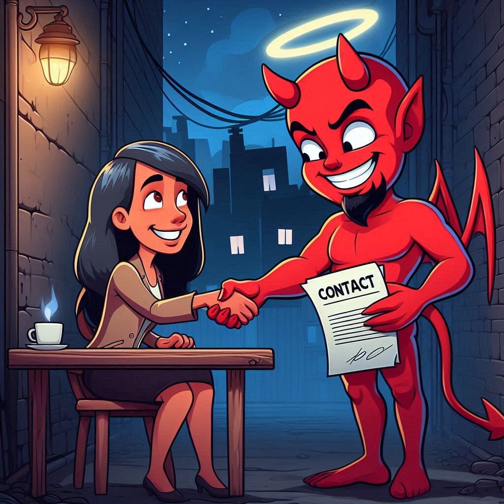 В одинокой деревне, окружённой мрачными лесами, жила девушка по имени Мария. Она была известна своим добрым сердцем и трудолюбием, но её жизнь не была лёгкой — родители не могли свести концы с концами, а сама она мечтала о большем, чем простая нищета. Тяжело жить с мыслью твоя жизнь зависит от денег, не просто жизнь, а достаток который дарил бы комфорт. Но почему-то деньги мутят наш разум и совсем забываются другие богатства. Однажды, в самый мрачный час ночи, когда луна скрылась за облаками, к ней подошёл таинственный странник. Его фигура была окутана тенью, а глаза светились ненормальным блеском. Он представился как Дьявол, и предложил Марии сделку: богатство и изобилие в обмен на её душу. Сначала она испугалась и отказалась, но, глядя на страдания своей семьи, она задумалась. Если бы она могла обеспечить родителям безбедное существование, это могло бы сделать её счастливой. Но денежное счастье всегда длиться недолго, только ты достиг этой цели, счастья как и не было. После долгих р