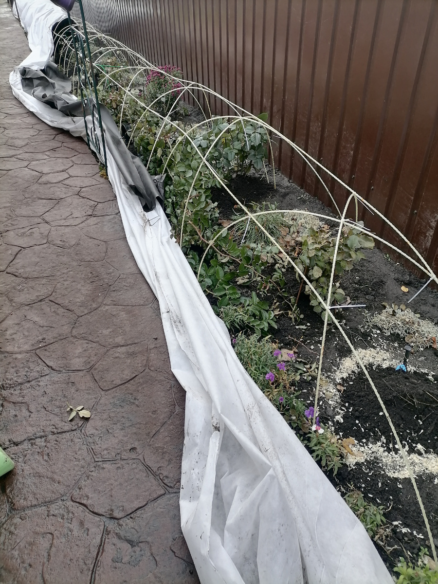 Сильный ветер сорвал укрытие на розах, вырвал все шпильки, которыми был пришпилин спандбонд 🙈пришлось снова всё укрывать и спандбонд фиксировать кирпичами 🤗🤗