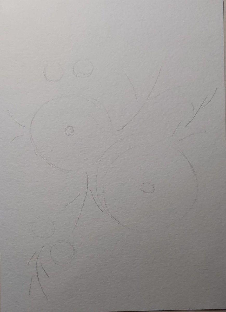 Нарисуем небольшую картину с цветами яблони. Основу композиции будут составлять два крупных цветка. В дополнение будут идти небольшие бутоны. Также добавим и нежной молодой листвы. 1. Для наброска кругами обозначим основные цветы. Наиболее крупные будут располагаться по центру. Более мелкими кругами обозначим бутоны. Линиями покажем, где будут распылаться веточки и листья. 2. Теперь добавим деталей на набросок. Прорисуем форму для листочков и бутонов. На крупных цветах обозначим центр и границы лепестков. 3. Прорисуем сами лепестки. 4. Красным или розовым оттенком с добавлением воды раскрасим цветы и бутоны. 5. Теплым нежным зеленым – листочки. 6. Коричнево-оранжевым нарисуем точечки-цветочки на дополнительных веточках. Этим же цветом сделаем и серединки у основных цветов. 7. Насыщенным темным зеленым прорисуем веточки у листьев и бутонов. На листочках веточки должны плавно переходить в центральную жилку. 8. Темно коричневым нарисуем дополнительные веточки для коричнево-оранжевых цвето