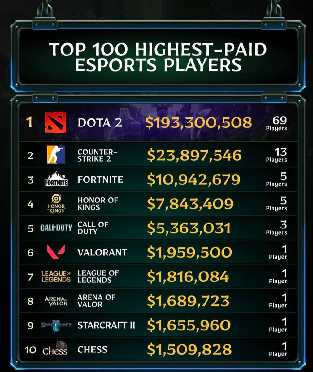 - В топ-100 игроков с самыми высокими призовыми в киберспорте вошли целых 69 (!) дотеров и всего 13 игроков в КС