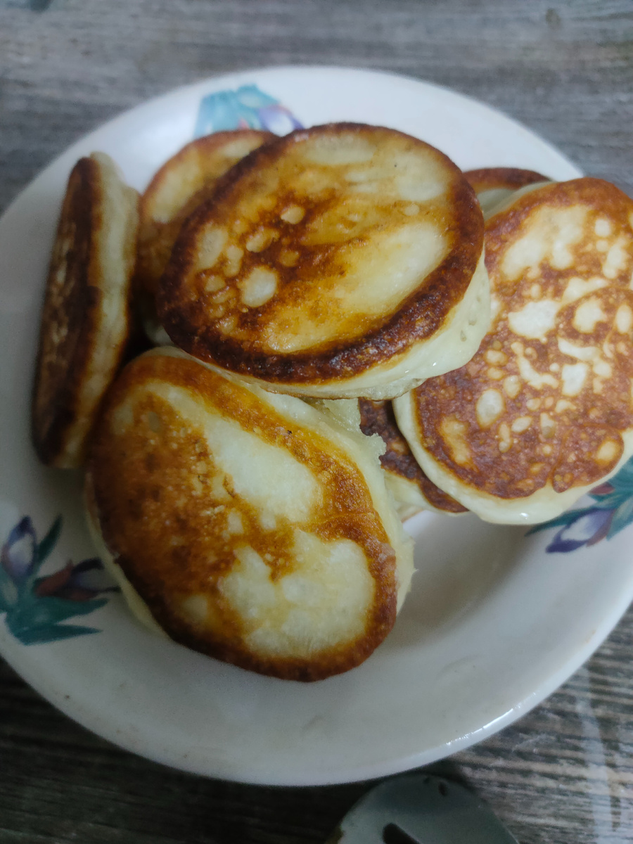 Здравствуйте, я рада снова приветствовать Вас на своем канале. Меня зовут Надежда и мне очень приятно, что Вы со мной, на моем канале «Быстрая кухня: рецепты на каждый день», где показываю наше меню на день. Сегодня утром я не тороплюсь. Времени у меня вагон и маленькая тележка, так как я еду на работу с приятельницей, выхожу в 07:10, а встала в 5 утра. На завтрак решила приготовить оладьи, осталось немного кефира и есть простокваша из молока. Молоко в основном мы используем в кашах, да еще муж пьет кофе с молоком. Завела тесто из кефира, соли, ст. ложки сахара и муки. Тесто делаю очень густое, уже в готовое тесто добавляю соду. Оставляю на минут 10 и начинаю выпекать. Вот такие оладьи получаются. Завтрак: оладьи, которые ели со сгущенкой, черный растворимый кофе, Вышла из дома в 07:08, погода отличная: на термометре -5 градусов, не успела дойти до назначенного места, как приехала приятельница, даже не почувствовала погоды. Зато очень долго стояли на КПП, даже ноги начали замерзать, н