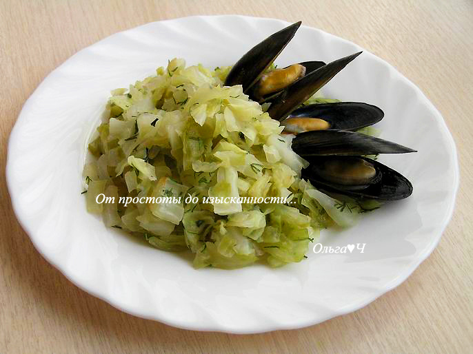 соль, перец по вкусу Приготовление: Лук нарежьте, обжарьте на растительном масле (это также можно сделать в чаше мультиварки). Капусту нашинкуйте, выложите в чашу мультиварки, добавьте лук, перемешайте. Налейте немного воды. Готовьте в режиме "Пароварка" около 20 минут. Добавьте рубленный укроп, перемешайте. Тем временем мидии выложите на разогретую сухую сковороду, накройте крышкой, готовьте 3-4 минуты, пока мидии не раскроются (если не раскрылись - выкидывайте), полейте вином, дайте выпариться спирту, снимите с огня. Капусту подавайте с мидиями. Приятного аппетита! Вам также могут понравиться: