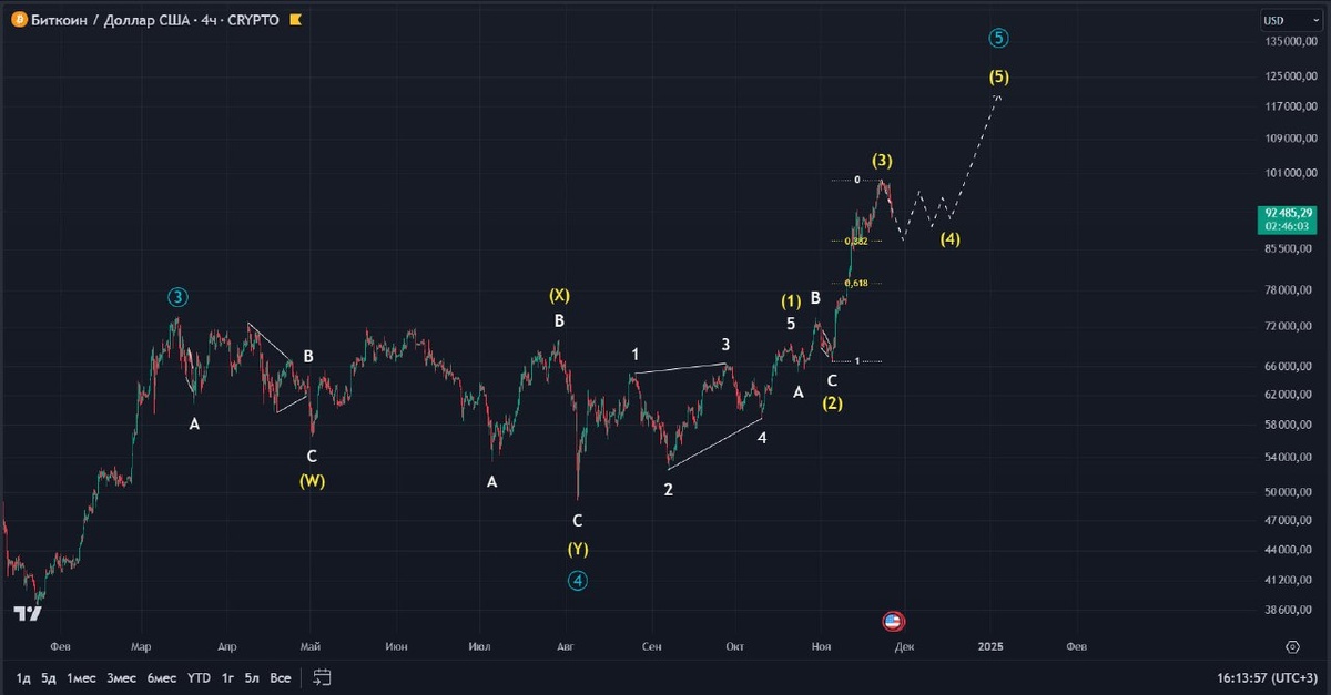 💰 Bitcoin Таймфрейм: 4h Зафиксировал часть прибыли в районе 100000.00 не случайно. Это психологически значимый уровень для цены, поэтому быстро мы его не преодолеем. Предполагаю, что здесь криптовалюта на какое-то время задержится в консолидации. Оптимальная цель снижения — это 87000.00, но можем опуститься и пониже. Рост BTC в моем видении ещё не окончен, сценарий отметил на графике. После коррекции старшей степени ожидаю продолжение восходящего движения. Криптовалютой торгую на бирже Bybit. #BTC #BTC