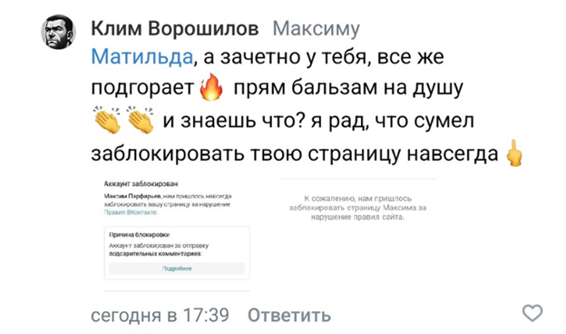 Таким образом, блокировка моего аккаунта была за мой комментарий в адрес фейкового аккаунта «Клим Ворошилов», преследующего меня (только с этого аккаунта) на протяжении этого года, следуя по социальной сети «ВКонтакте», публикуя в мой адрес комментарии, содержащие оскорбления и ложную информацию.