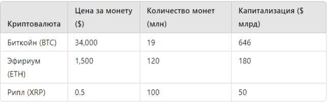 Таблица ниже демонстрирует, как капитализация и цена криптовалюты соотносятся друг с другом: