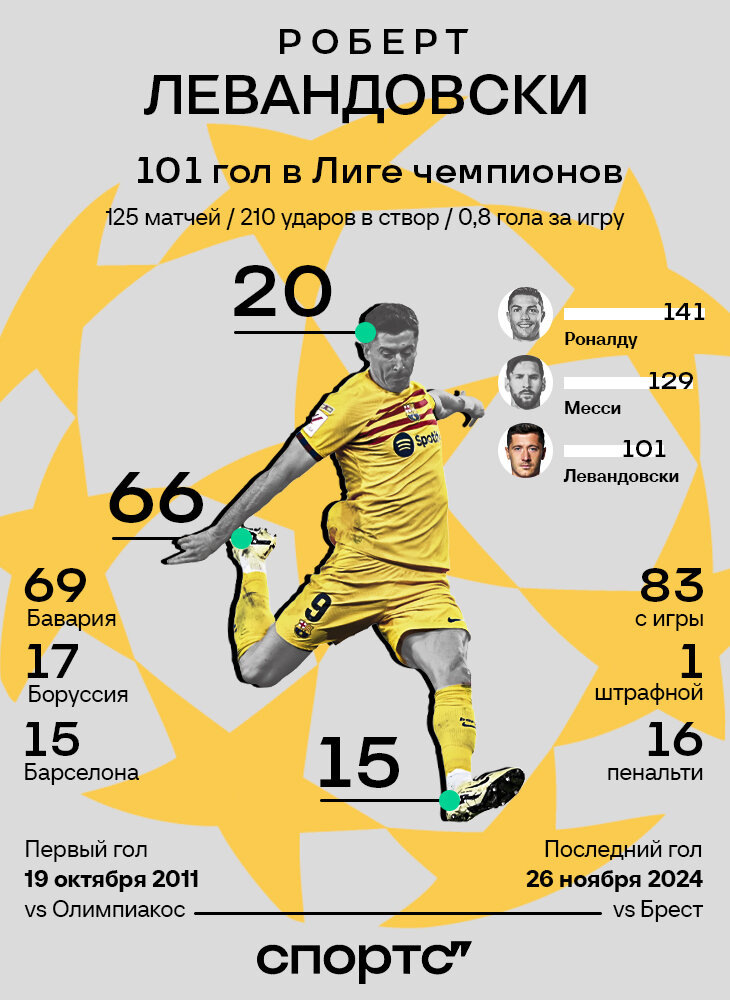 100 голов (и сразу 101!) Левандовского в ЛЧ – больше лишь у Роналду и Месси. Одна картинка