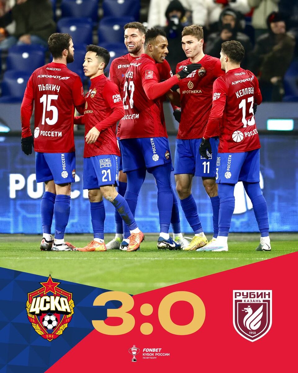 ЦСКА со счётом 3:0 обыгрывает «Рубин» и выходит в 1/2 финала Пути РПЛ Кубка России. Как это было? Стартовый состав. О важности матча нет необходимости говорить, а потому было понятно, что на поле окажется состав, максимально приближенный к основе. Марко Николич, как и в матче с «Ростовом», выбрал схему 3-5-2, где треугольник в центре составили Пьянич, Обляков и Кисляк, а за завершение атак отвечали Мусаев и Файзуллаев. На воротах традиционно для Кубка был Слава Тороп, в центр обороны вышел дисквалифицированный в РПЛ Роша, а слева вместо Кругового вышел Милан Гайич. Первый тайм. Несмотря на итоговый разгромный счёт первой половины, сути игры он не отображал. За весь тайм у «Рубина» было минимум 2 почти стопроцентных момента, которые по стечению обстоятельств не закончились голами. Если же говорить о ЦСКА, то армейцы забили даже больше, чем создали, благодаря шикарным ударам Келлвена и Аббоса, а также виртуозной длинной передаче Роши и реализованного выхода 1-на-1 от Тамерлана Мусаева