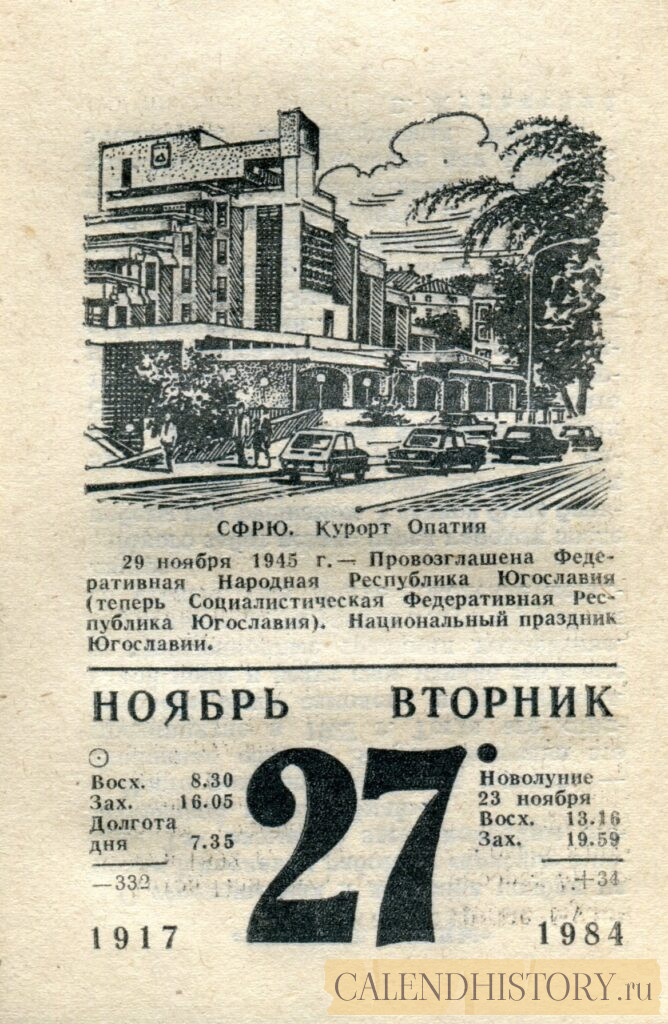 Итак, сегодня 27-го ноября и у нас на календаре 1984-й год. Перед нами листок советского календаря для женщин за этот день. На календаре у нас вторник - 27 ноября 1984-го года. СФРЮ. Курорт Опатия 29 ноября 1945 г.— Провозглашена Федеративная Народная Республика Югославия (теперь Социалистическая Федеративная Республика Югославия). Национальный праздник Югославии. *** Оборотную сторону листка этого календаря можно посмотреть у нас по ссылке на сайте. Другие листки советских календарей смотрите у нас на сайте - CALENDHISTORY.ru ДРУГИЕ ЛИСТКИ ОТРЫВНЫХ КАЛЕНДАРЕЙ: