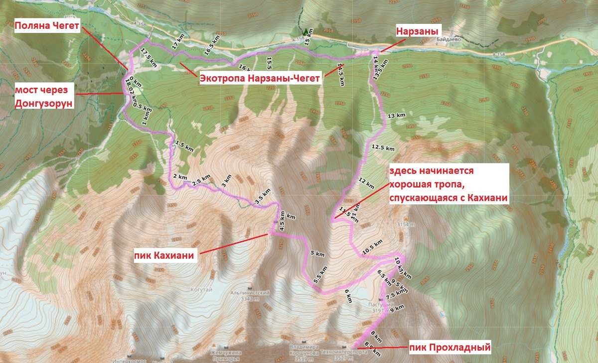 Спустившись, мы попили нарзана, и по экотропе вернулись обратно на поляну Чегет. Итого маршрут получился на 20 км, и прошли мы его за 10 часов не спеша и с массой привалов. Технически он совершенно простой и очевидный. Виды очень красивые! В любой момент можно повернуть обратно, или наоборот, добавить какие-то интересные повороты. Но если идти его целиком, то нужно потерпеть крутой спуск к нарзанам. Ну и по времени долго получается, почти весь световой день. Если идти медленнее нас, то в день можно и не уложиться.