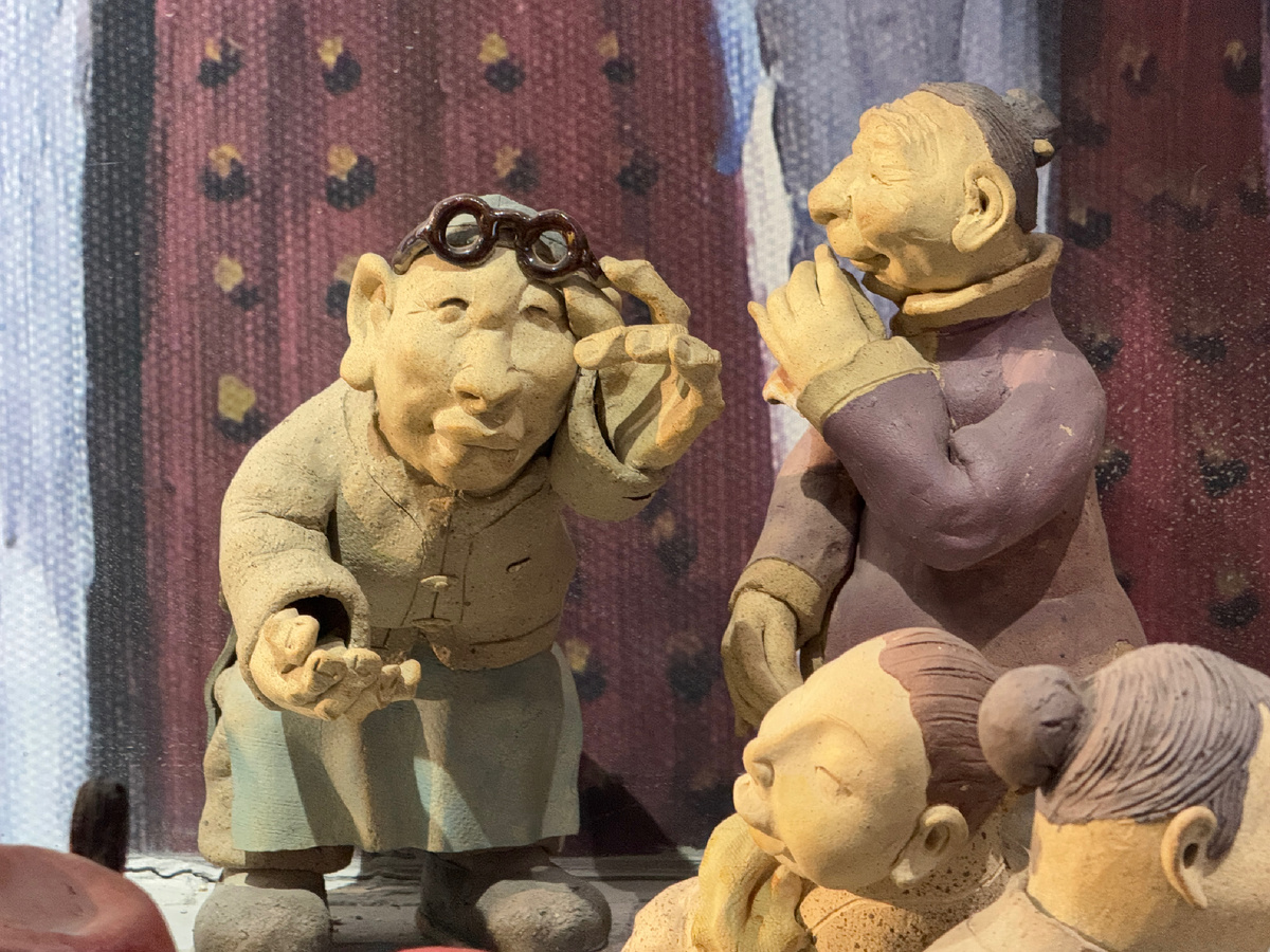 Все фигурки вылеплены из глины, и у каждой свой характер, свое лицо, одежда. Художник явно с юмором относится к своим персонажам, немного посмеивается над их простодушием, крестьянской хваткой, простотой. Лица персонажей далеки от привычных стандартов красоты, я бы даже сказала, что многие уродливы, но может китайцы по-другому себе представляют красивое лицо. И все очень выразительные и с темпераментом. Вся жизнь горожан показана на фоне прекрасных пейзажей провинции Шаньдун и реальных городских зданий.